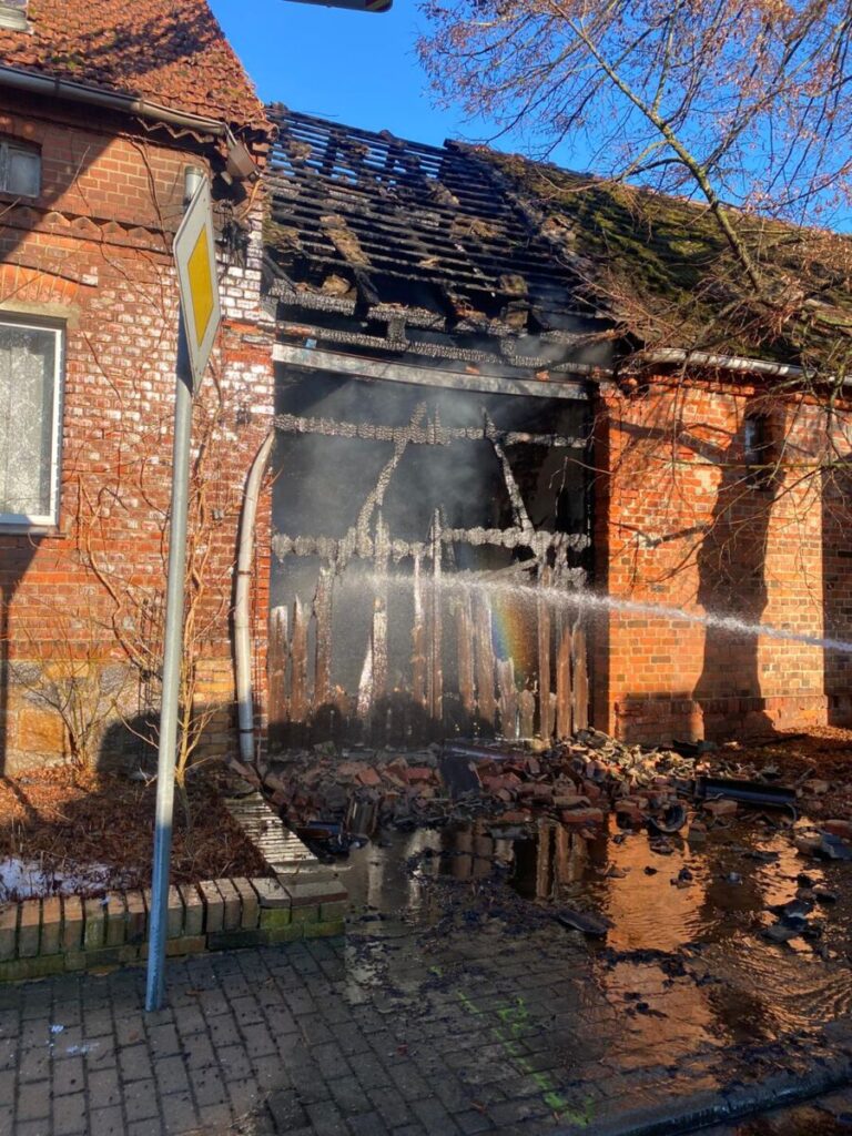 Hohenbucko. Am Montag, den 19.01.2026, kam es in der Ortschaft Hohenbucko (Amt Schlieben) zum Brand einer Tordurchfahrt. Diese stand zwischen einem Wohnhaus und der ebenfalls zum Dreiseitenhof gehörenden Scheune. Wie der Einsatzleiter und Amtsbrandmeister Guido Schmidt gegenüber Blaulichtreport Elbe-Elster mitteilte, konnten beide angrenzenden Gebäude ohne Brand- oder Wasserschäden geschützt werden.